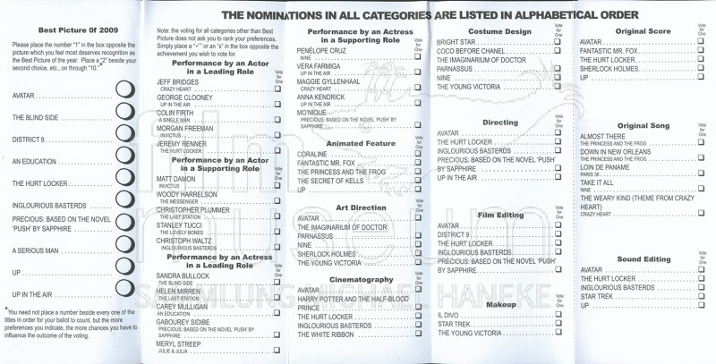 Stimmzettel für die 82. Oscarverleihung, März 2010
