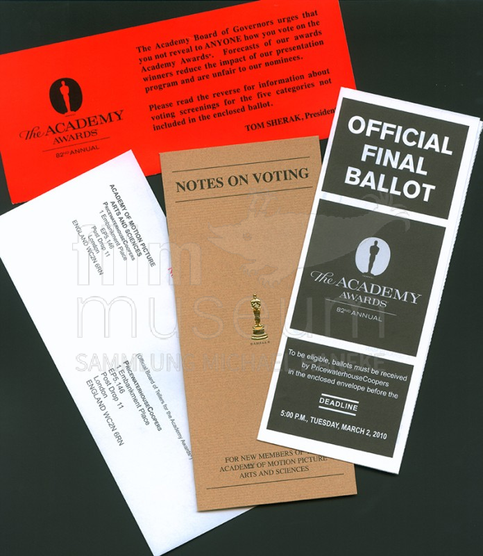 enthält: Unausgefüllter und nicht abgesendeter Stimmzettel für die 82. Oscarverleihung 2010, inkl. Rücksendekuvert an "PriceWaterhouse" sowie eine Broschüre "Notes on Voting", die Anmerkungen und Richtlinien zur Stimmabgabe enthält