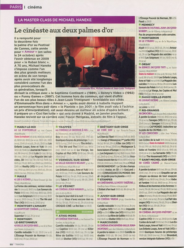 | enthält: | 1 Exemplar der Fernsehbeilage des "Nouvel Observateur" (frz.) vom 13.10.2012: Ankündigung zu einer Master Class mit Michael Haneke am 13.10.2012 in Paris (S. 88) |