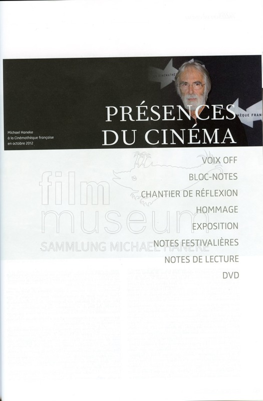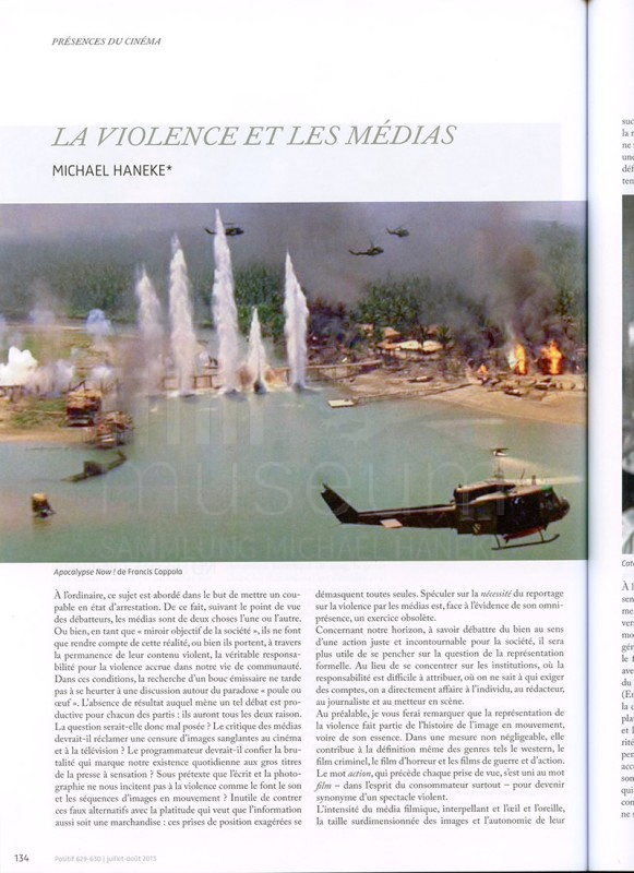 | enthält: | 1 Exemplar der frz. Monatszeitschrift: frz. Übersetzung eines Essays von Michael Haneke "La violence et les médias" (S. 134-137), aus dem Deutschen übersetzt von Eithne O'Neill |