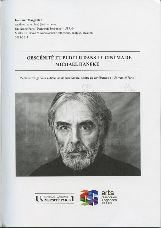 | enthält: | Masterarbeit (frz.), vorgelegt an der Universität Paris 1 Panthéon Sorbonne (Master 2 Cinéma & Audiovisuel). Übersetzung des Titels: "Obszönität und Scham im Kino Michael Hanekes" |