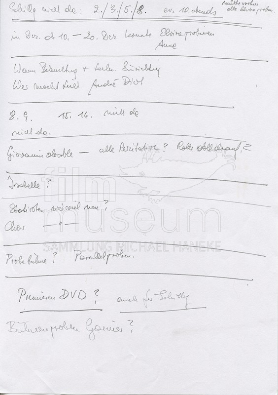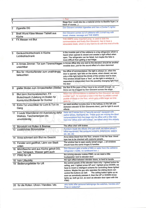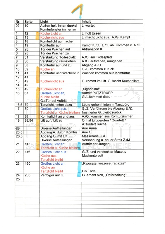 | enthält: | Konvolut in rosa Umschlag. Enthält u.a. Notizen, Beleuchtungslisten, Probenpläne, Mailkorrespondenzen hinsichtlich der Wiederaufnahme der Inszenierung, Liste mit Props und Ausstattungsgegenständen, Castingunterlagen für Komparsen (2 Bl.) |